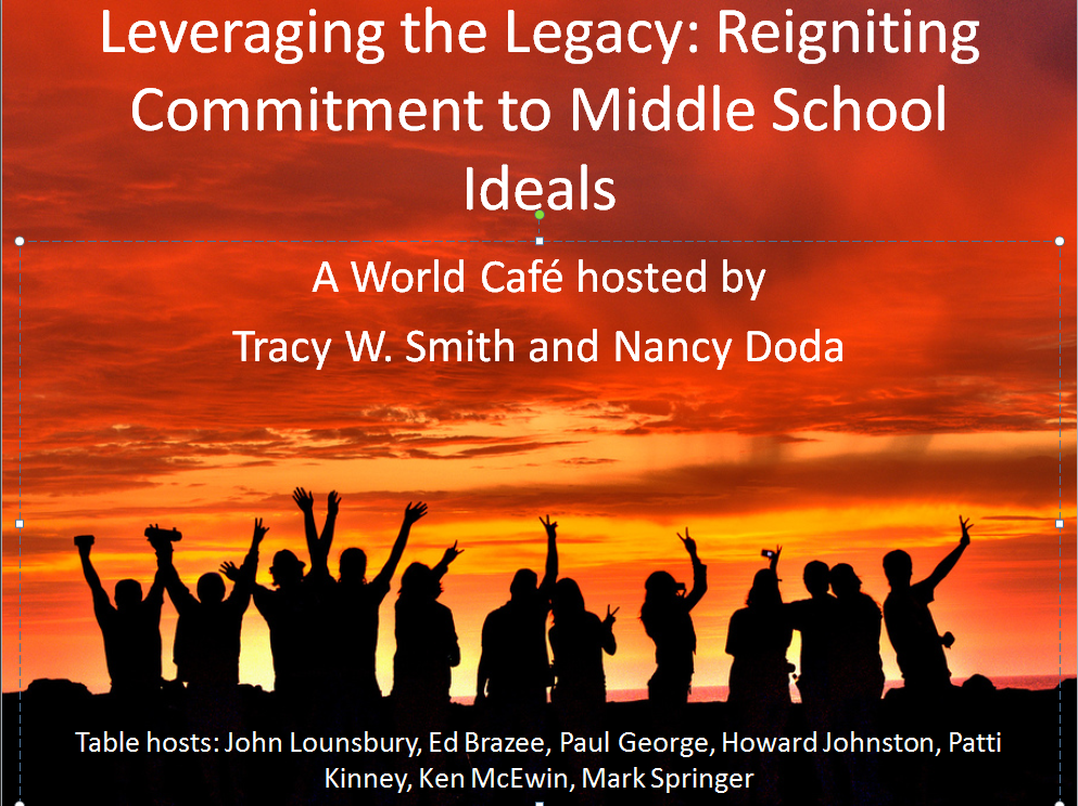 The Association for Middle Level Education Conference will be held in Nashville, TN, on November 6-8, 2014. I am very excited to be co-hosting a World Cafe Conversation with Nancy Doda during the conference. The session, titled, Leveraging the Legacy: Reigniting Commitment to Middle School Ideals, will be held Thursday, November 6, from 2:30-3:45 p.m. in Presidential Ballroom A. John Lounsbury will be providing opening remarks to the session. Nancy Doda and Tracy Smith will provide a description of the World Cafe process, which participants can take back to their schools and districts to engage students, teachers, parents, administrators, and community members in courageous conversations about middle level education. Patti Kinney, Howard Johnston, Mark Springer, Edward Brazee, and Paul George will serve as table hosts in the World Cafe conversation. To open the session, we will have a presentation of inspirational quotations ( Legacy Project Slides) from middle grades founders and prominent teachers. We will also have some slides that provide information about the World Cafe Process (Leveraging the Legacy_2014).